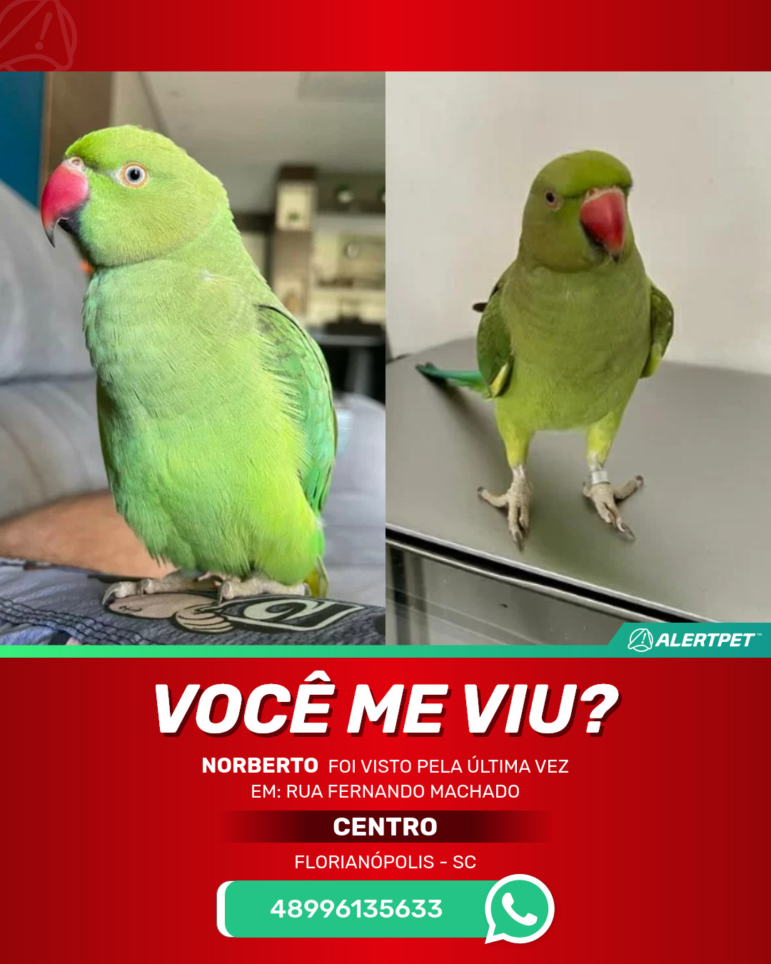 #AlertPet #Procurase #PassaroDesaparecido #Florianopolis #ProcuramosNorberto