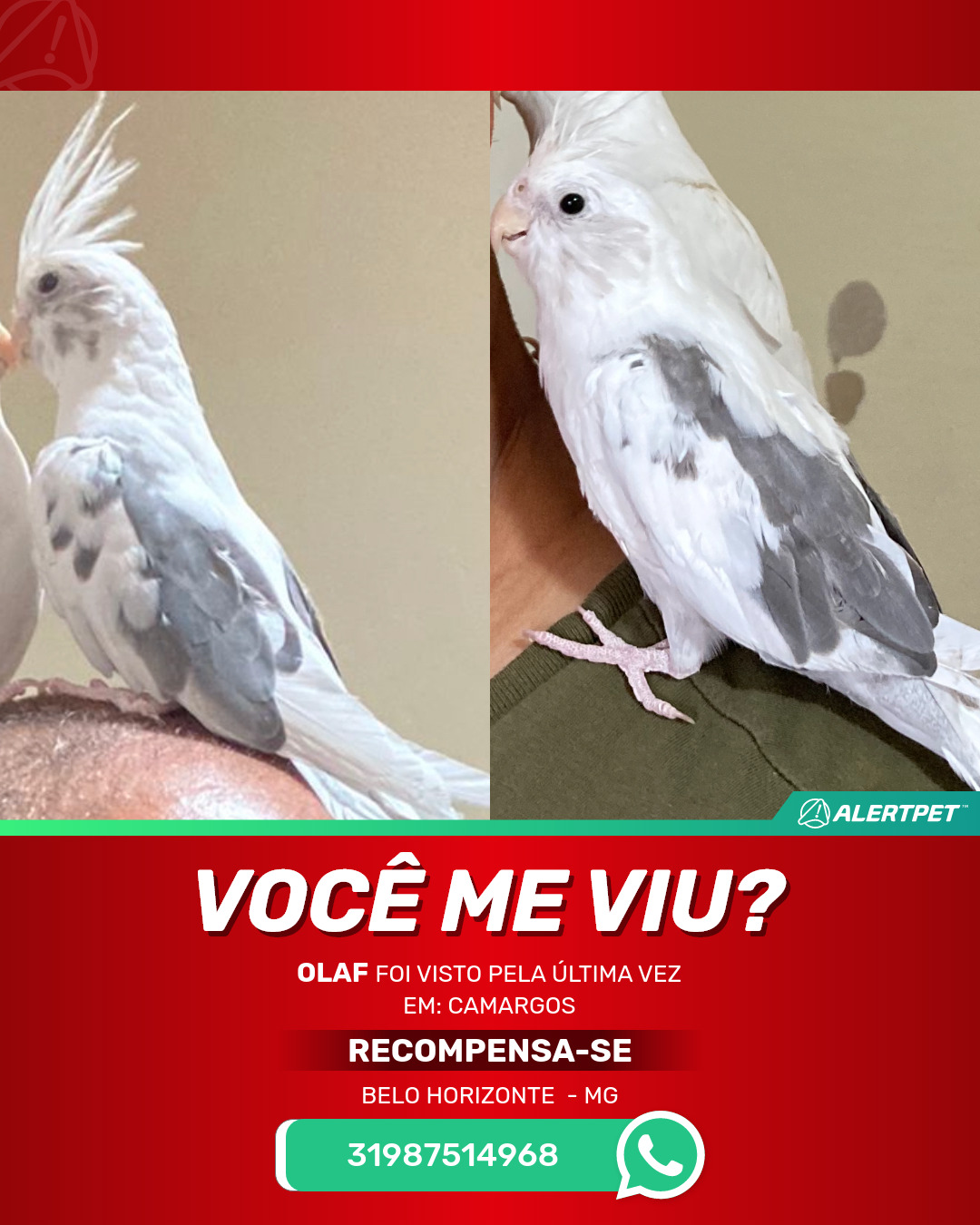 #AlertPet #Procurase #PassaroDesaparecido #BeloHorizonte #ProcuramosOlaf