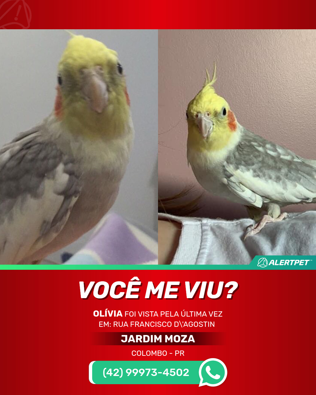 #alertpet #procurase #PássaroDesaparecido #Colombo #procuramosOlívia