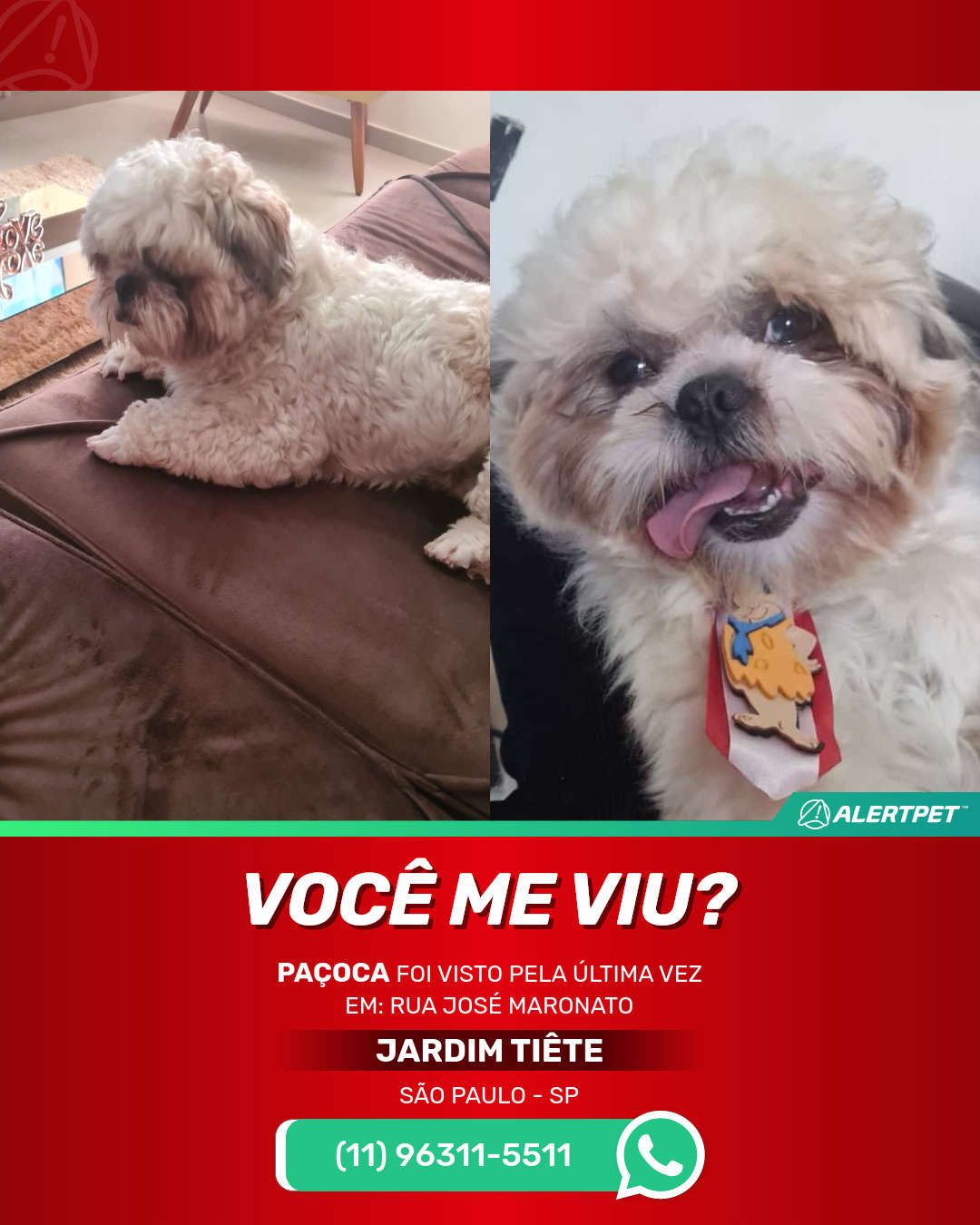 Temos duas crianças pequenas que não param param chorar com saudades do paçoca, cujo uma delas sofre de problemas respiratórias, desde a ida do nosso membro da família a criança vem tendo diversas crises! eu peço por favor e pelo bem da minha família que me ajudem a encontrar nosso cachorro, pois para nós não é apenas um cachorro e sim um filho.