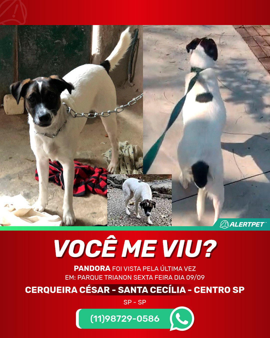 Recém adotada, fugiu da casa nova dia 9/9 nos jardins, não conhecia o bairro, foi vista no parque Trianon na av Paulista, depois na av angelica , esta sem coleira ‘e branca tem uma pinta redonda nas costas, rabo comprido branc’o com um ponto preto onde junta com o corpo, é dócil esta muito assustada e faminta, nunca morou na rua.
