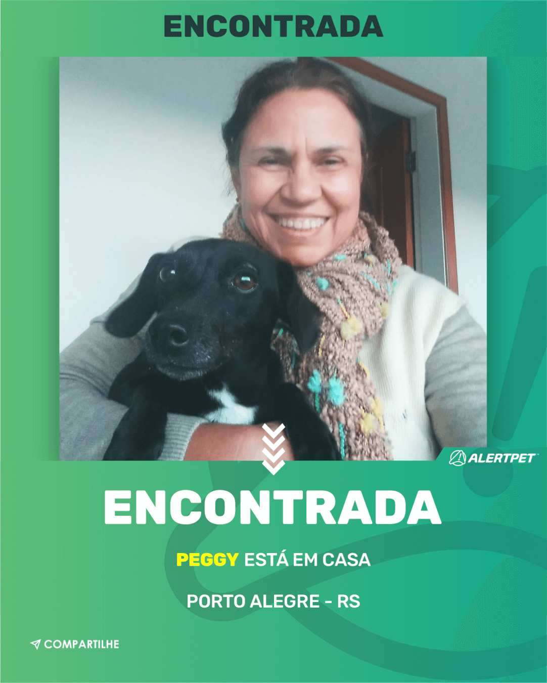 Quero agradecer imensamenre o trabalho da equipe AlertPet. Encontrei a Peggy quase um mês depois de sua fuga. O trabalho é muito sério e competente. Vida longa à AlertPet fazendo muita gente feliz.
