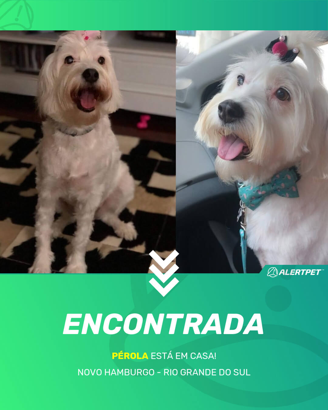 A Perola foi caminhar em volta da nossa casa no sitio e acho que se perdeu e nao conseguiu voltar. Ja fizemos grupos de busca no meio do mato, ja usamos drones, carro de som, oublicamos em jornal, falamos com os vizinhos, colocamos posters e por enquanto nao tivemos nenhuma pista.
