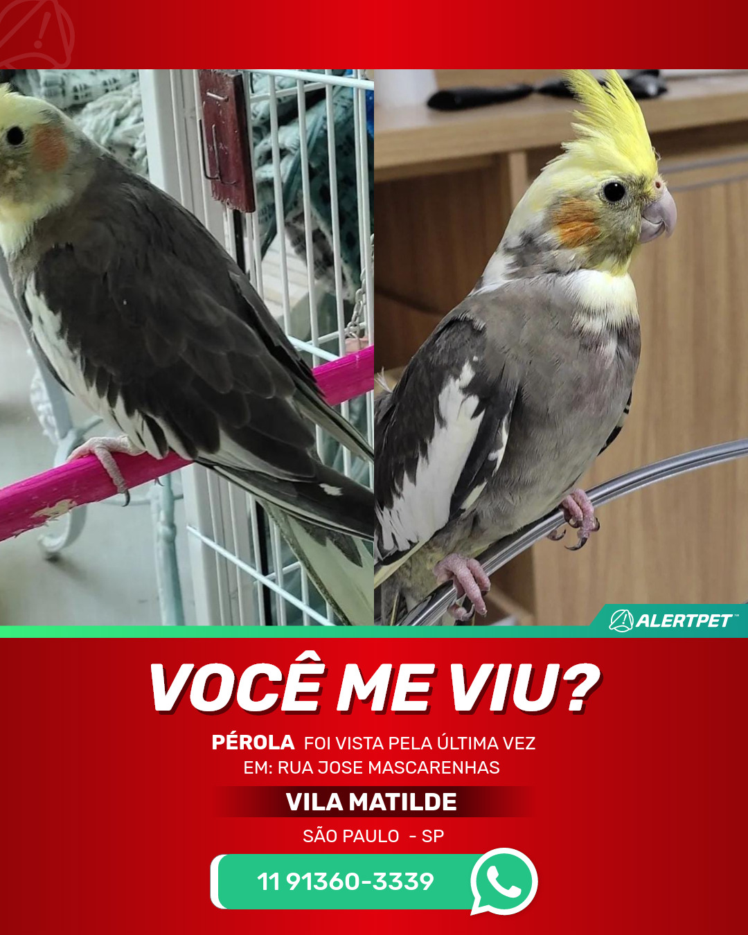 Pelo amor de Deus a pérola é uma calopsita especial em relação a xuidsdos… ela tem problema de respiração… por favor ajudem ela a voltar para nós, minha irmãzinha está desamparada ,por favor . Eu darei uma boa recompensa