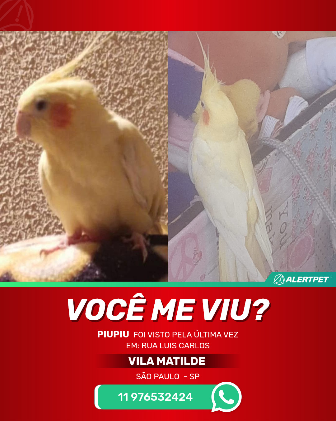 #AlertPet #Procurase #PassaroDesaparecido #SaoPaulo #ProcuramosPiupiu