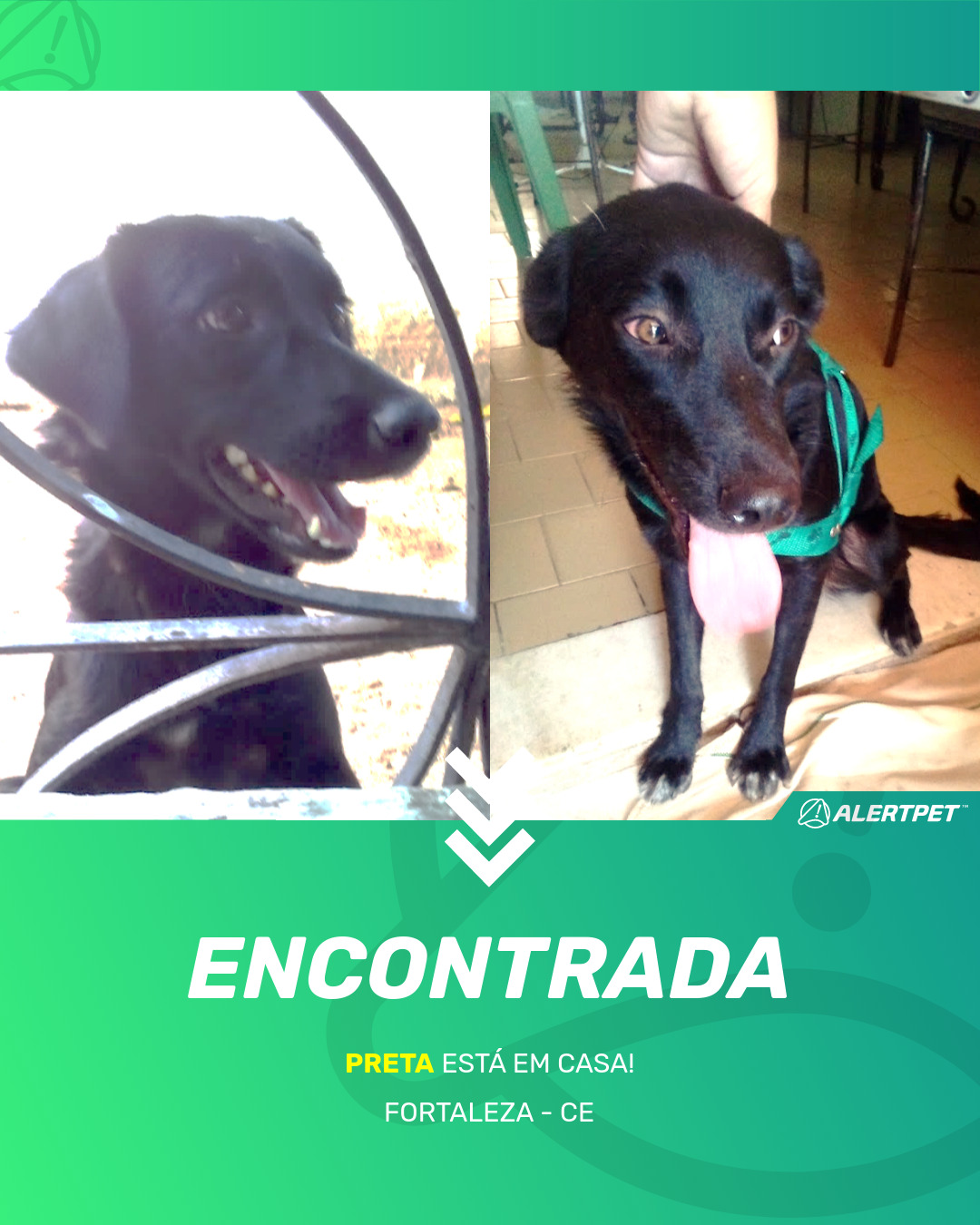 Oi! Por favor vc pode nos ajudar a encontrar a Pretinha? Nossa cadela fugiu dia 14 de março na segunda etapa do conjunto Ceará, ela é toda preta com alguns pelos brancos da idade nas patinhas e focinho (ela tem 7 anos) e estava SEM COLEIRA. Porte médio.