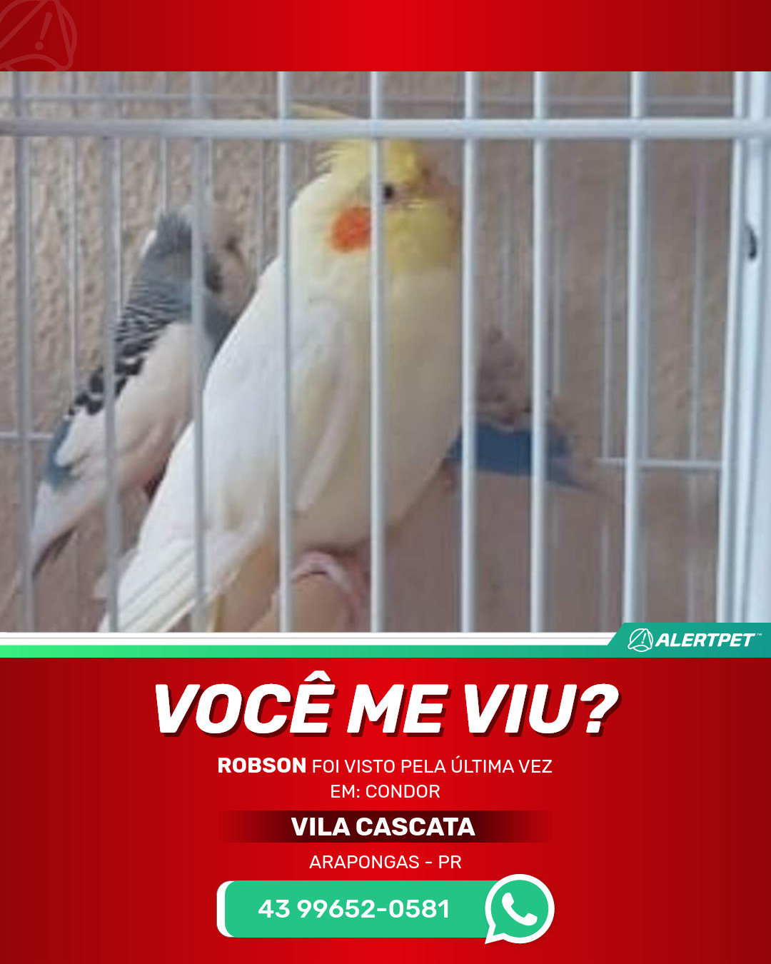 #AlertPet #Procurase #PassaroDesaparecido #Arapongas #ProcuramosRobson