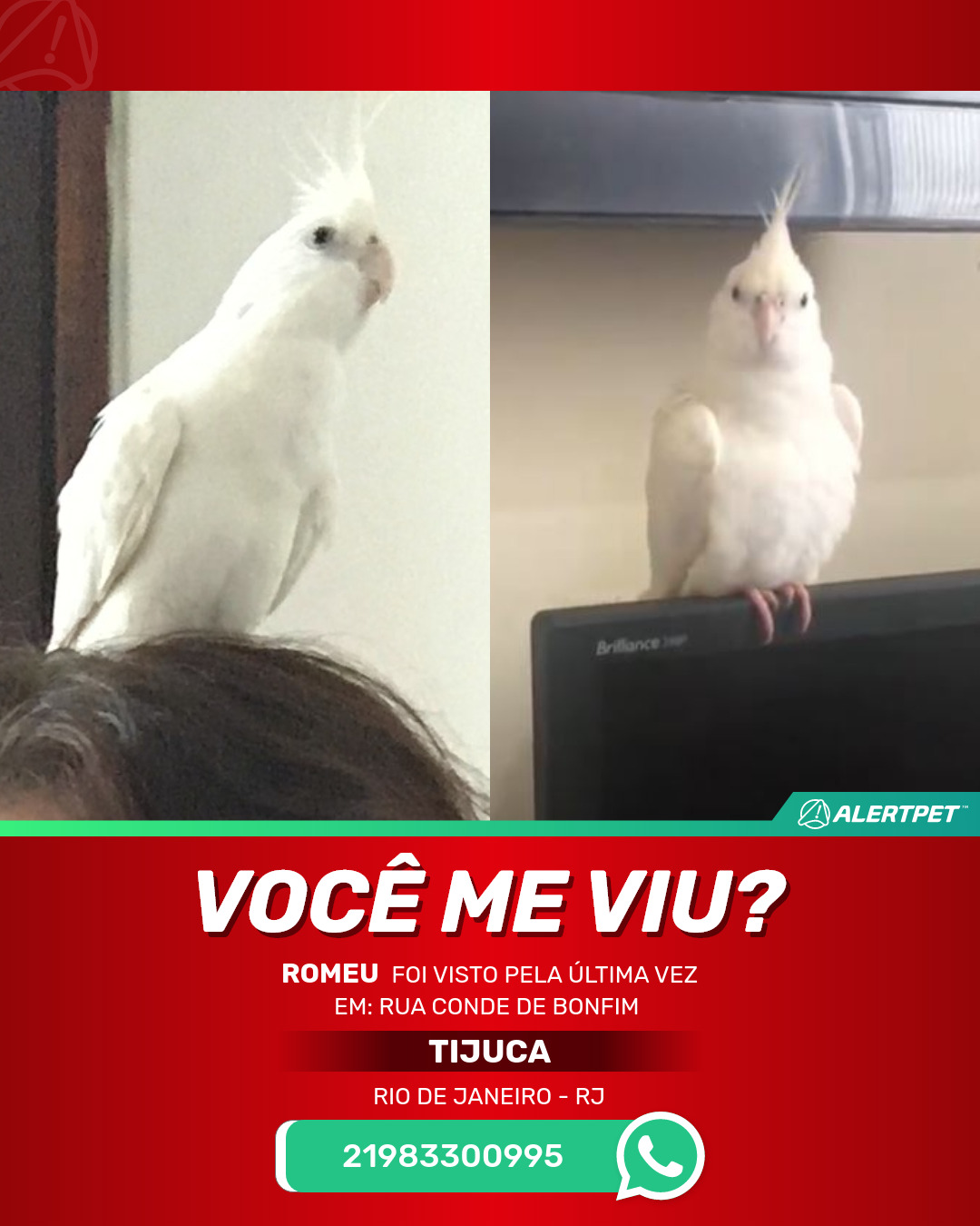 #AlertPet #Procurase #PassaroDesaparecido #RioDeJaneiro #ProcuramosRomeu