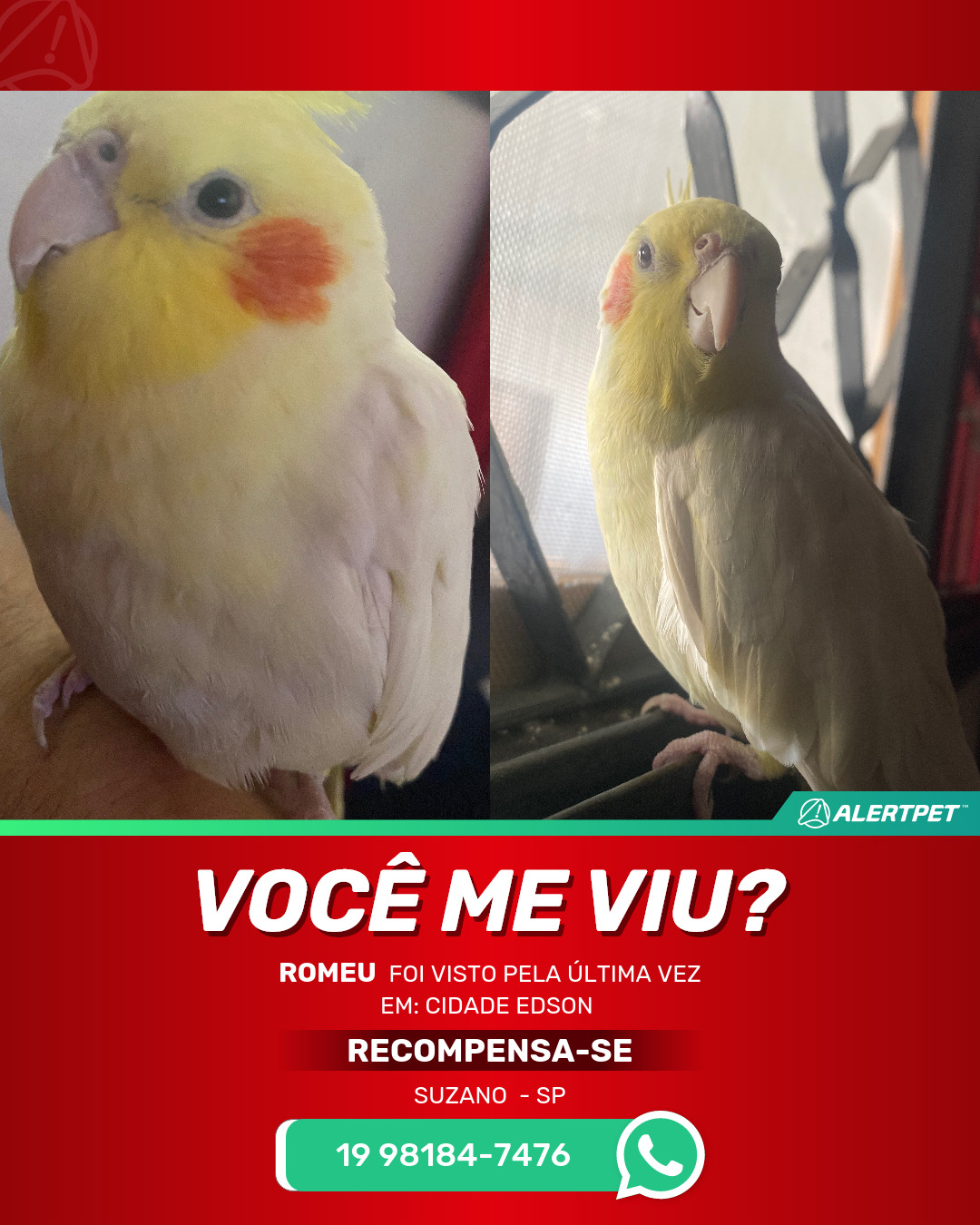 #AlertPet #Procurase #PassaroDesaparecido #Suzano #ProcuramosRomeu