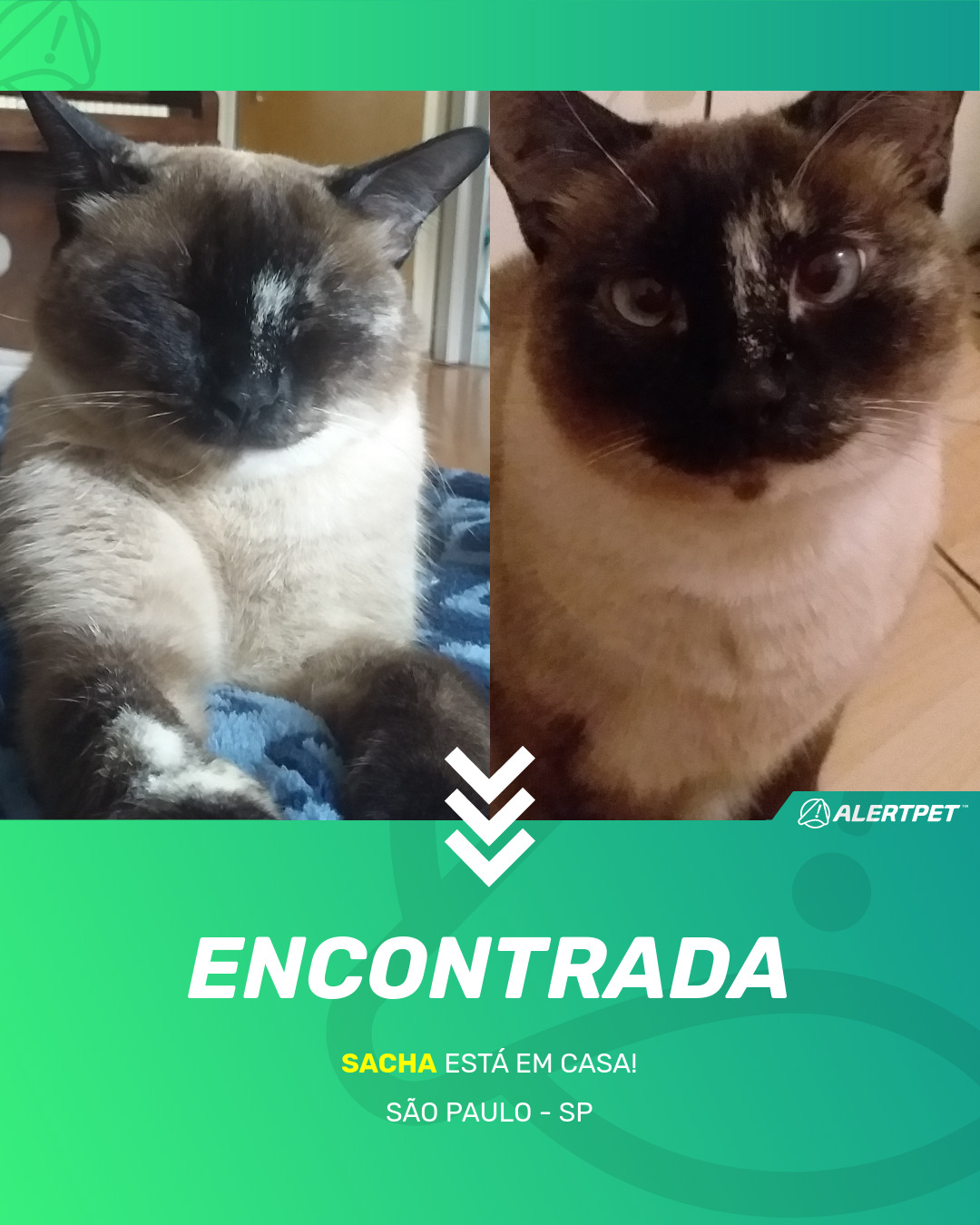 Gata fêmea, pelagem mestiça siamês, com algumas manchinhas brancas pelo corpo como no rosto, patinha direita da frente e queixo com duas cores, marrom de um lado e branco do outro. Olhar vesguinho, e olhos da cor azul. Cores predominantes marrom claro e marrom escuro. Saudável. Fugiu ou caiu pela janela do primeiro andar, amortecendo a queda num toldo do comércio que fica embaixo (imaginamos isto pelas marcas de patinhas e unhas no toldo, bem abaixo da janela). Estava em adaptação com a casa porque nos mudamos há apenas 5 dias e por isso ela estava assustada. É bem dócil e atende pelo nome de Sacha. Tem 6 anos de idade e é castrada. Sempre morou em apartamento e NUNCA saiu pra rua. Extremamente bem cuidada, gata de apartamento, que dorme na cama comigo. Só se alimenta de ração. Talvez esteja machucada pela queda. Por favor, estou desesperada. Tenho dois filhos adolescentes, inclusive um deles é deficiente auditivo e é extremamente apegado à gatinha.