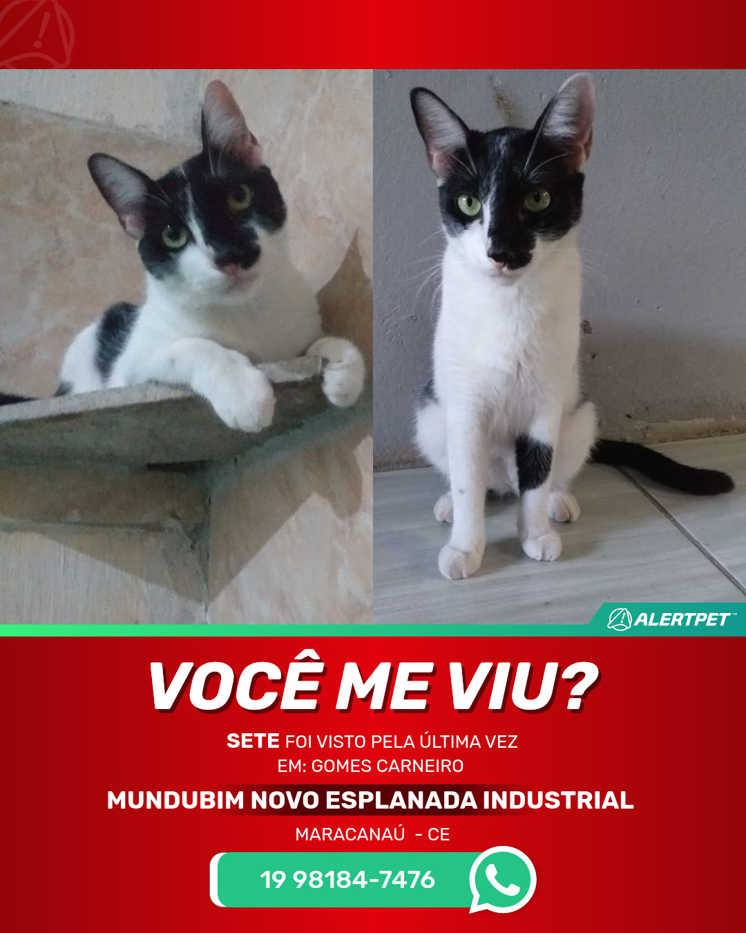 Eu imploro a quem o encontrou que me devolva pois ele é muito apegado a mim e se passa muitos dias ele pode adoecer ele é portador de filv e felv doença que pode ser transmitida para outros animais atrás do contato.. Estou arrasada por favor me devolva meu sete