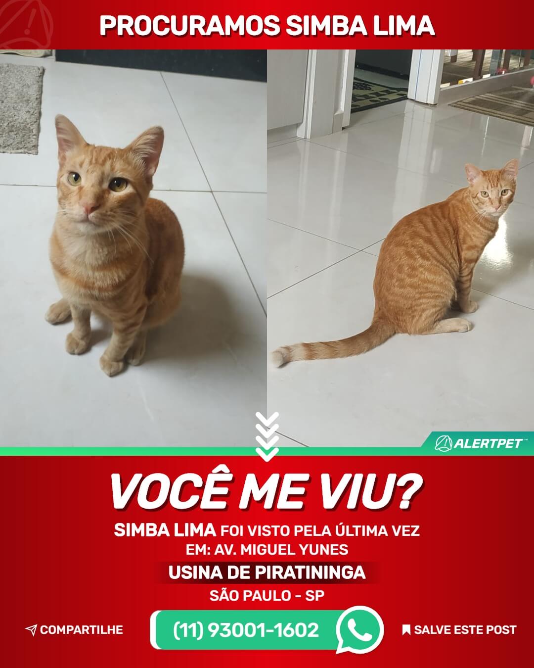 #alertpet #procurase #GatoDesaparecido #São Paulo #procuramosSimba Lima