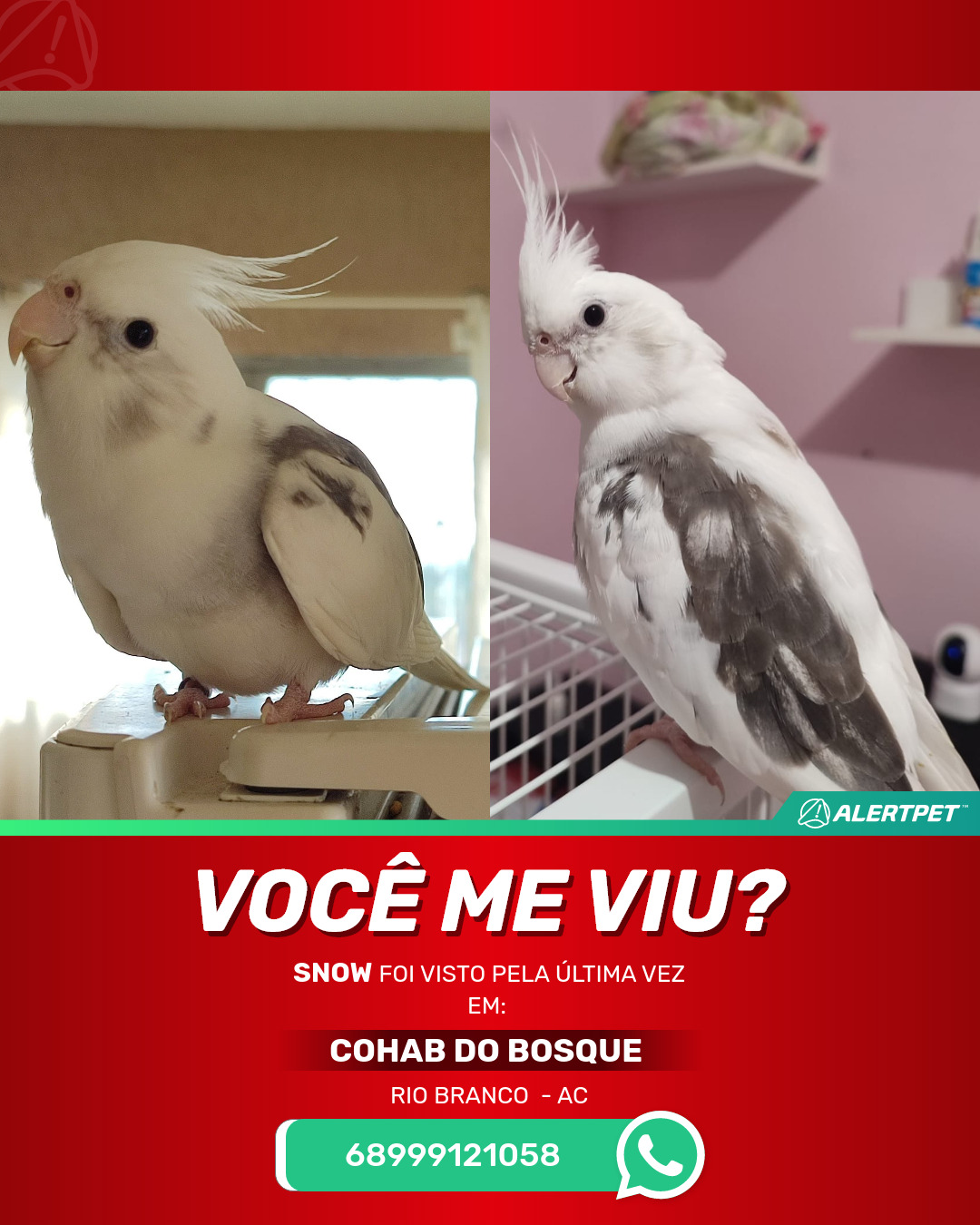 #AlertPet #Procurase #PassaroDesaparecido #RioBranco #ProcuramosSnow