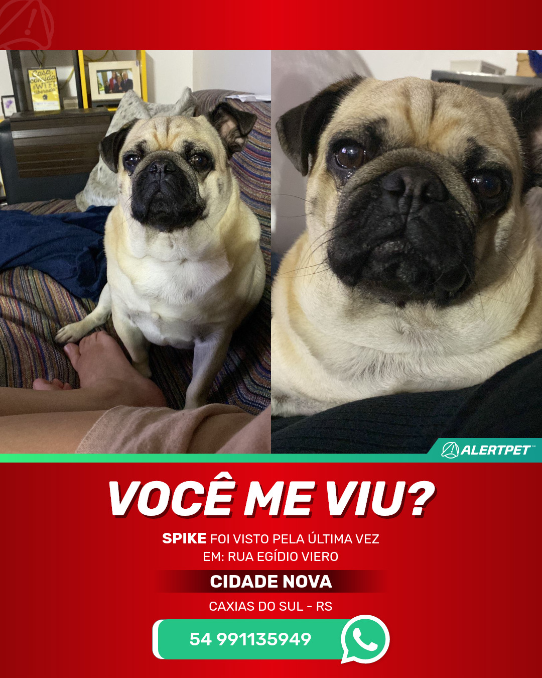 O Spike foi adotado pela nossa família, depois de passar por quatro casas. Ele era muito apegado principalmente ao Marcelo, andava todo o tempo atrás dele, que está sentindo muita falta do Spike. Se você viu ele, por favor nos ajude a encontrá-lo.