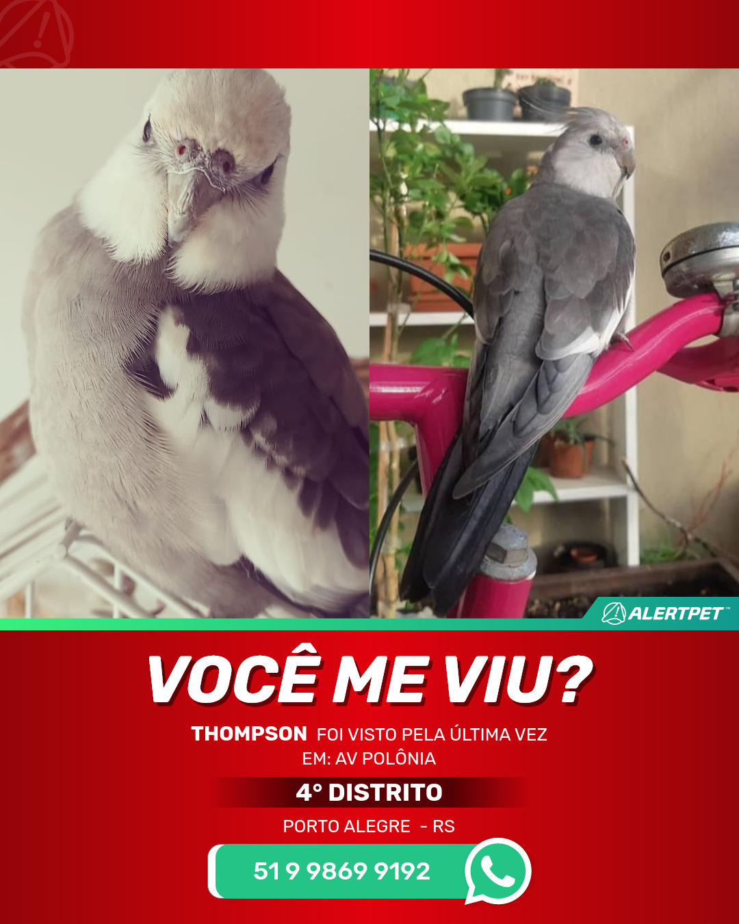 #AlertPet #Procurase #PassaroDesaparecido #PortoAlegre #ProcuramosThompson