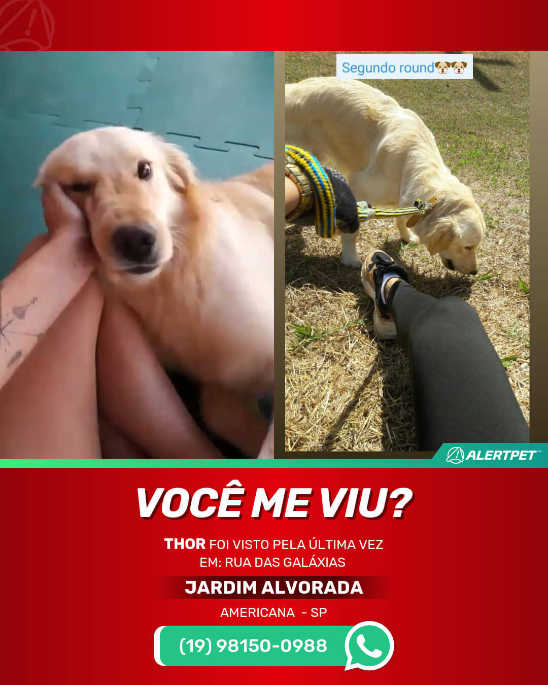 Peço encarecidamente a ajuda de todos nesse momento, nosso cachorro, melhor nosso Thor, não é só um cachorro, é um membro da família, faz parte da nossa vida, dos nossos filhos, do nosso dia-a-dia. Esse cachorro foi criado e educado por nós desde bebê, inclusive interage, brinca com meus filhos todos os dias… os meninos amam o cachorro e choram todos os dias sentindo a falta do melhor amigo. Estamos aflitos e desesperados procurando nosso cachorro, por isso peço aqui a união de todos, para encontrá-lo. Ontem, andei de bicicleta pelo bairro todo (Jd. Alvorada – Americana -SP), de casa em casa, por mais de 2 horas com a esperança de encontrá-lo, tenho certeza absoluta que com a união de todos, nesse momento, conseguiremos achar nosso amado cachorro Thor. Me prontifico a recompensar quem encontrar o Thor! Conto mais uma vez com todos!!! Karina Izidorio