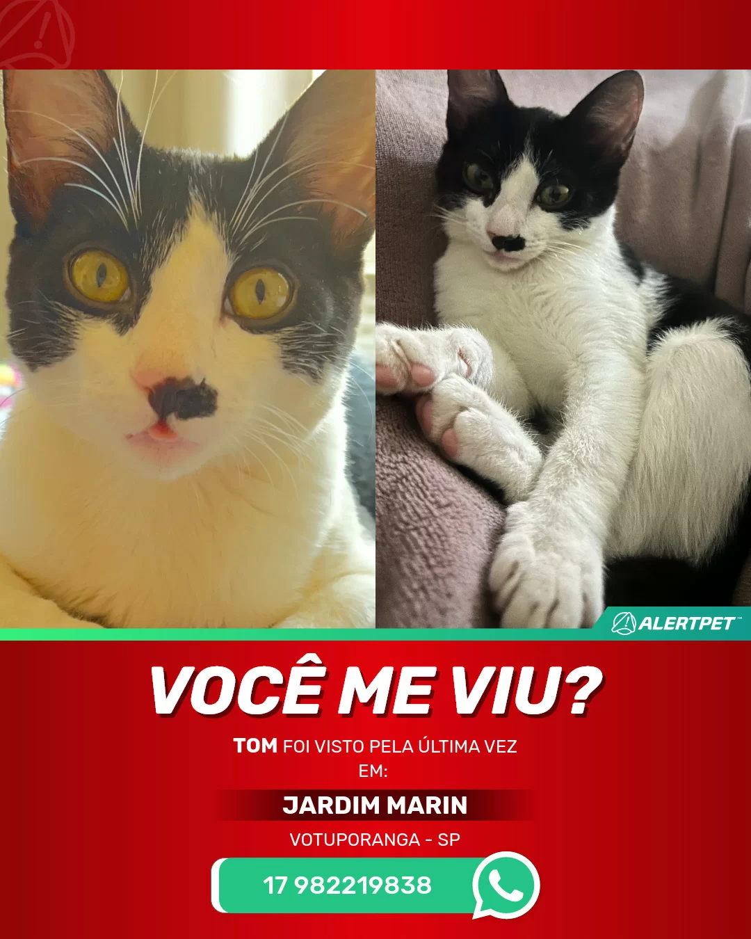 Sumiu dia 22/07, nas proximidades do Jardim Marin, em Votuporanga. Ele pode ter entrado no capô do carro e descido em qualquer lugar da cidade. O Tom é muito amado e tem crianças sofrendo muito sem saber seu paradeiro. Nos ajude a ajude a encontrar o TOM.