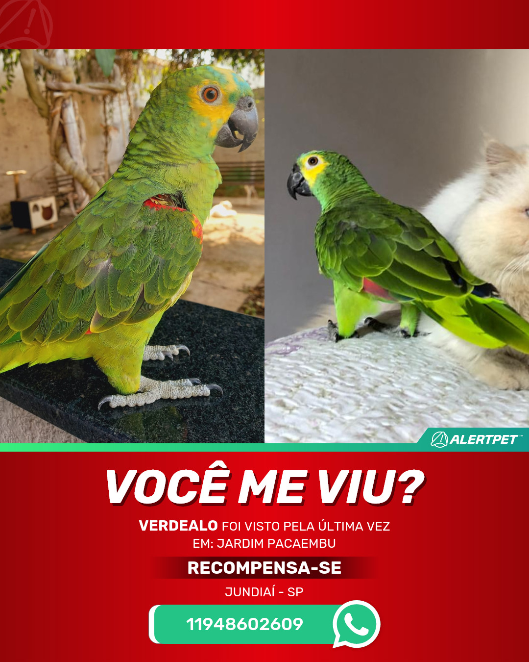 #AlertPet #Procurase #PassaroDesaparecido #Jundiai #ProcuramosVerdealo