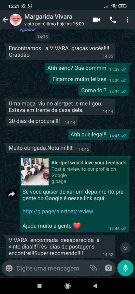 Caso tenha informações de um pet desaparecido comunicar imediatamente os tutores pelo telefone que está no anúncio.