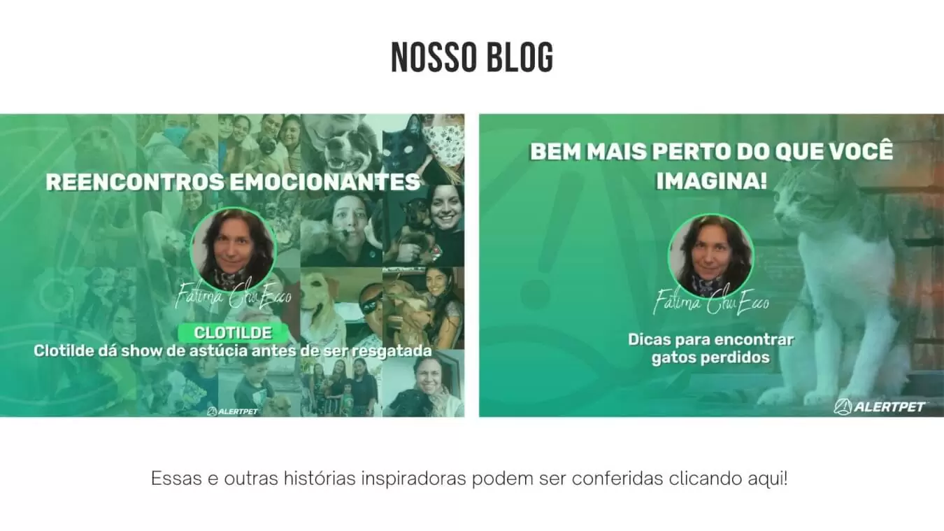“Sempre a cada mês, a AlertPet escolhe as 3 melhores histórias com finais felizes que são contadas pela jornalista Fátima ChuEcco no nosso blog. Tem, por exemplo, a do cão Beethoven: uma história tão incrível que parece um daqueles filmes da Disney. Do Rio ele foi parar em Minas Gerais. Graças aos posts da AlertPet uma pessoa identificou o Beethoven numa oficina mecânica e comunicou o tutor. Foram 15 dias de angústia que terminaram com um reencontro emocionante”.